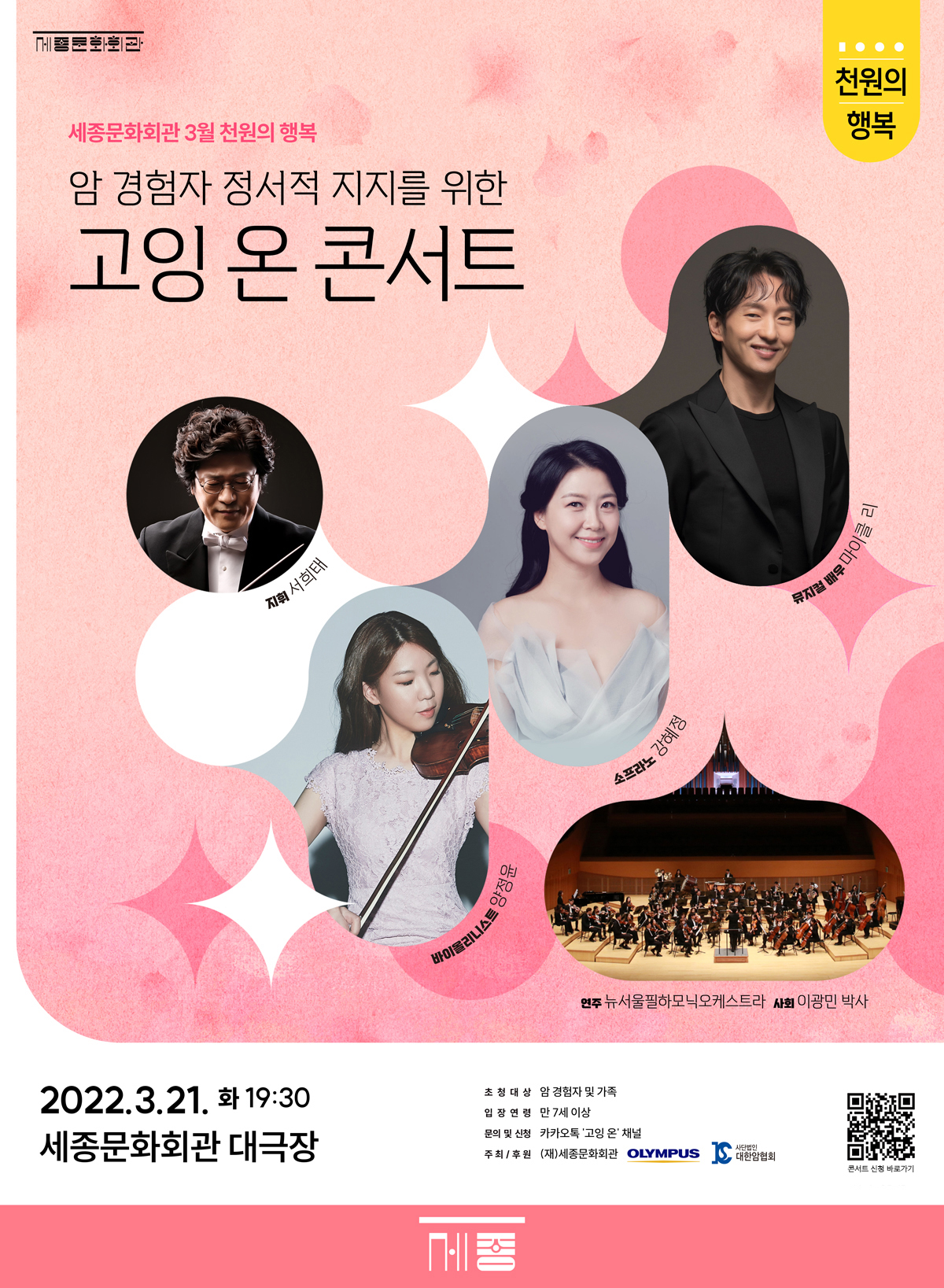 공연에는 △‘미스 사이공’, ‘노트르담 드 파리’ 등에서 타이틀롤을 맡으며 대중적 인지도가 높은 뮤지컬 배우 마이클 리 △‘피가로의 결혼’, ‘마술피리’ 등의 다수의 오페라에서 주역을 맡은 소프라노 강혜정 △오스트리아 무지크페어라인 황금홀, 체코 스메타나홀, 독일 헤라클래스홀 등 세계 각지의 유명 콘서트홀에서 공연한 바이올리니스트 양정윤이 무대에 오른다. 요한 슈트라우스 2세가 작곡한 ‘남국의 장미’, ‘뮤지컬 회전목마’ 중 ‘당신은 결코 혼자가 아니야’, 쥘 마스네의 ‘타이스 명상곡’, 가곡 ‘강 건너 봄이 오듯’ 등 암 경험자 및 가족들에게 클래식과 뮤지컬을 넘나드는 폭넓은 레퍼토리의 음악을 들려줄 예정이다.