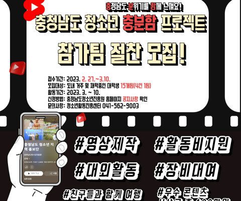 재단법인 충청남도청소년진흥원(원장 직무대리 이순실)은 지역 탐방을 통해 지역사회 홍보 콘텐츠를 제작하는 ‘청소년 충.분.함 프로젝트’에 참가할 청소년을 3월 10일까지 모집한다고 밝혔다….