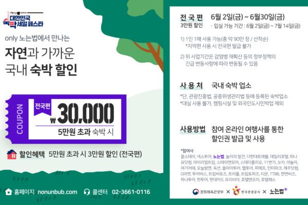 노는법 운영사 바바그라운드(대표 허정)는 문화체육관광부와 한국관광공사가 공동 주관으로 실시하는 ‘여행가는 달과 함께하는 2023 대한민국 숙박세일 페스타’에 참가한다고 밝혔다. 또 노는법에서만…